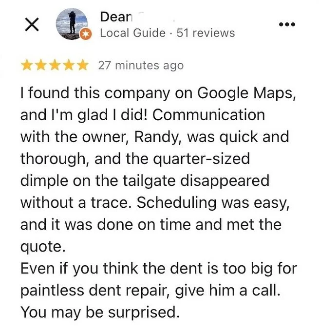 First time I used this service and I was very pleased with the results. The customer service I received was excellent. Randy returned my phone calls quick and my car was done when he said he would have it. I will definitely recommend him if you need any type of dent repair to your vehicle. Excellent work and great customer service.